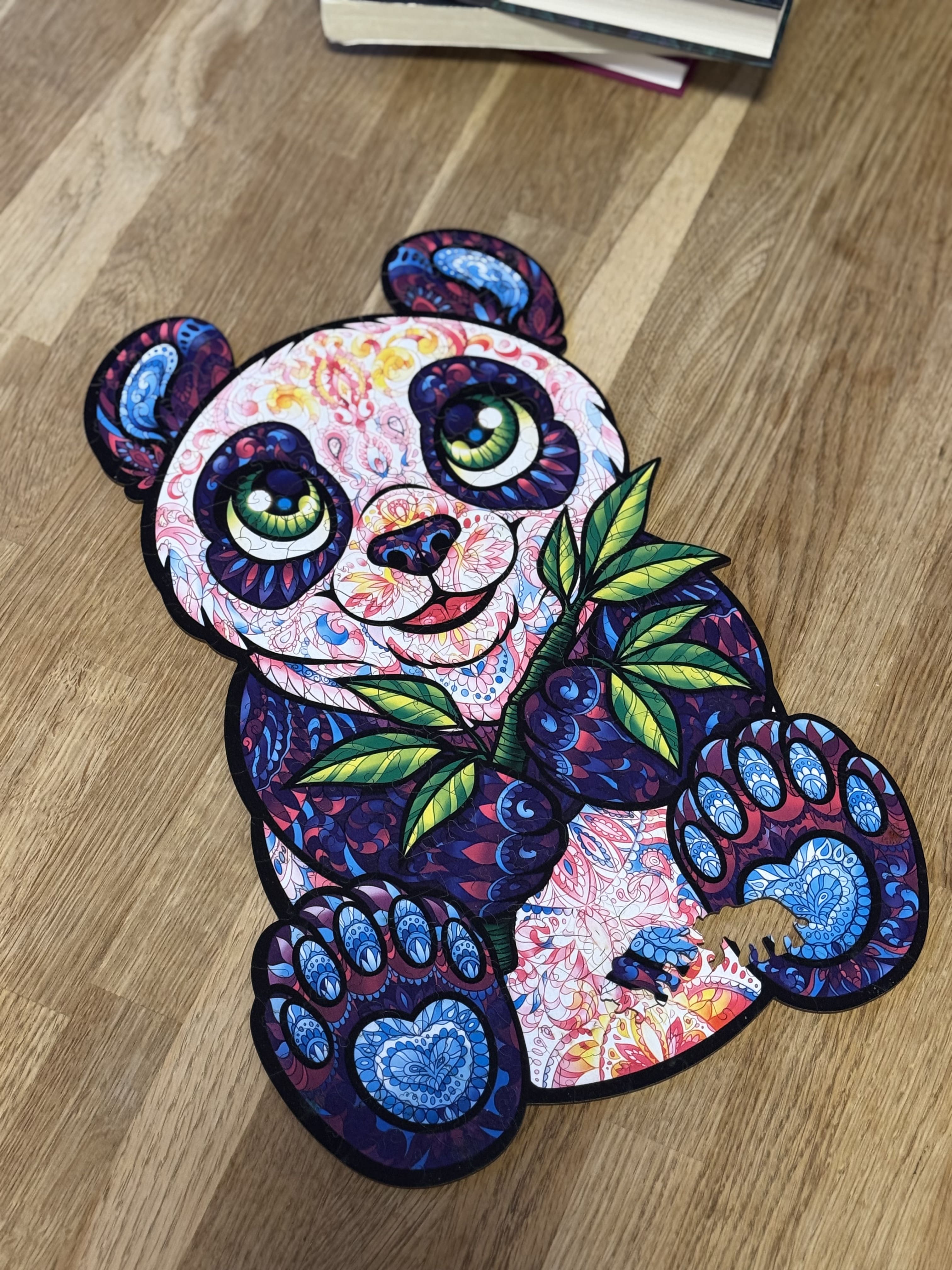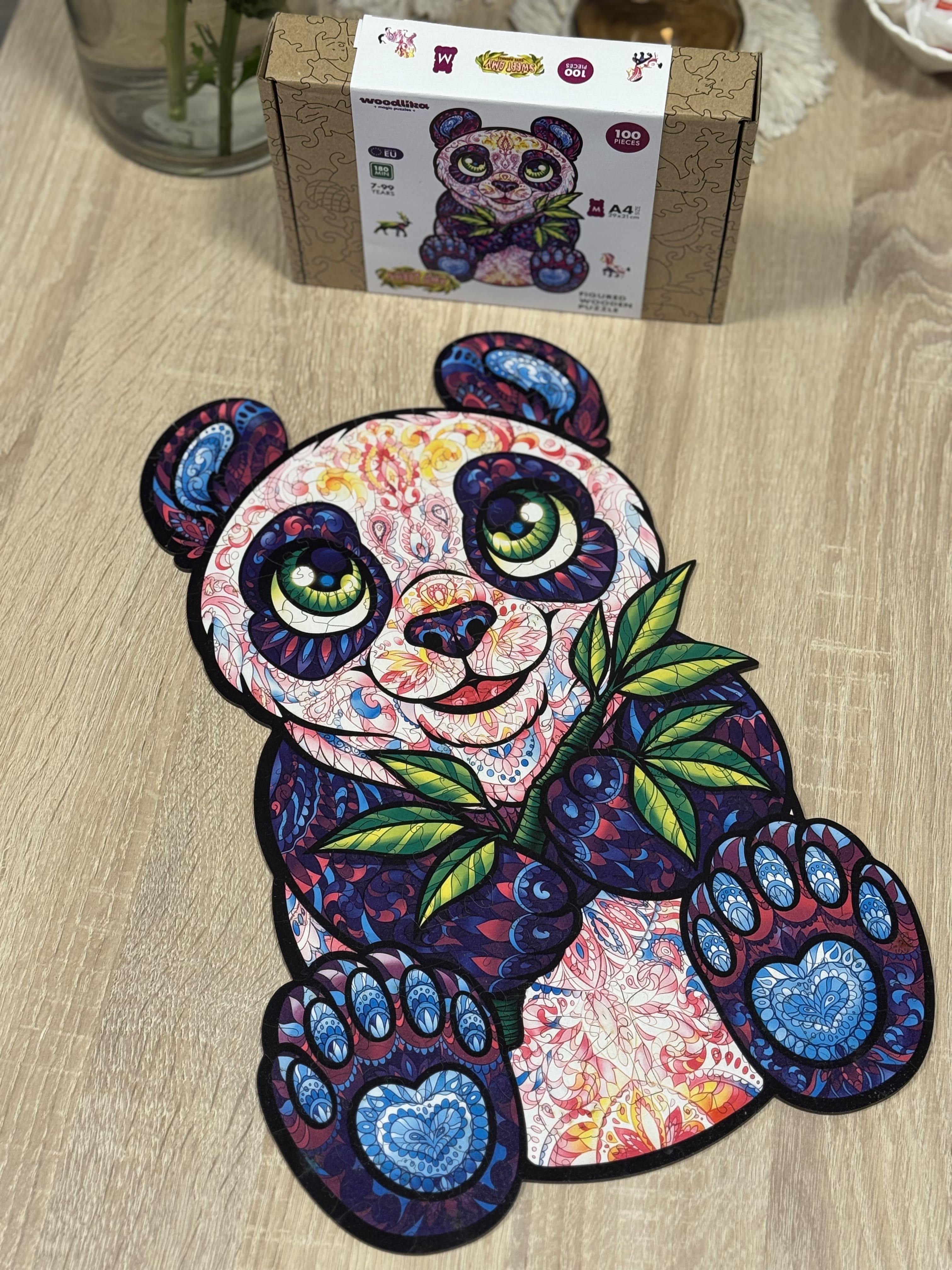 Cunoaște un panda amabil și drăguț. Puzzle din lemn premium format din 100 de piese, realizate în formă unică, cu tematica pădurilor de bambus. Dimensiune 29×21 cm. Fabricat și certificat în UE🇪🇺