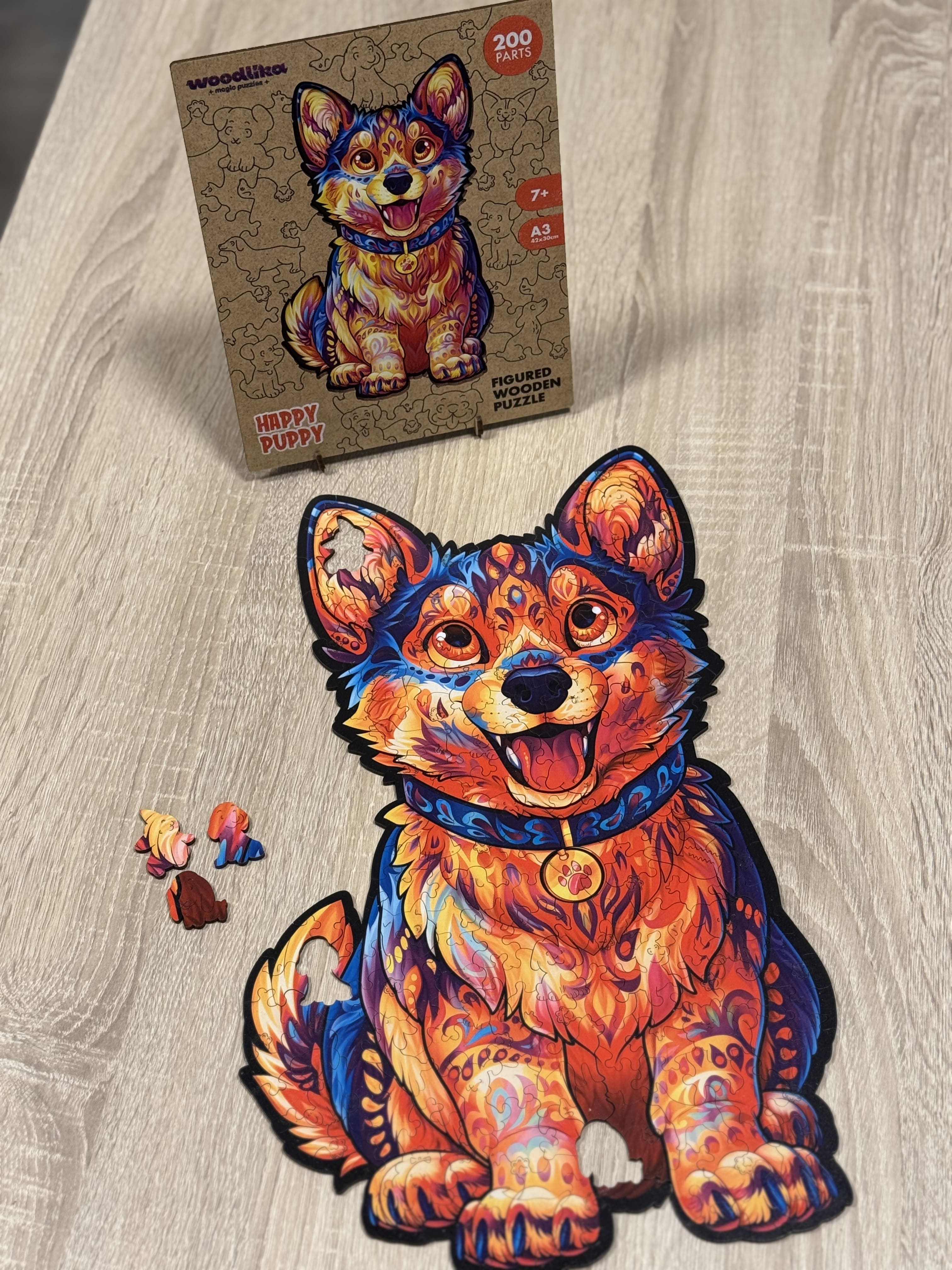 Zâmbetul unui prieten cu patru picioare. Puzzle din lemn premium, realizat din 100 de piese în formă unică, inspirat de diversele rase de câini. Acestea garantează până la 3 ore de divertisment. Dimensiune 29×21 cm. Fabricat și certificat în UE🇪🇺
